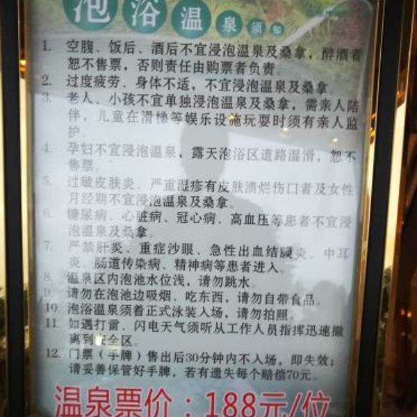 景区引导和服务都很多,温泉池数量和类型比较多,有21个吧,就是商业味比较浓,门票贵了,卫生一般...取票很便利。景区引导和服务都很多,温泉池数量和类型比较多,有21个吧,就是商业味比较浓,门票贵了,卫生一般,可能人多原因,水质感觉未按承诺定时更换,其他都挺好。