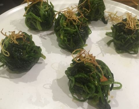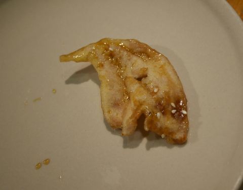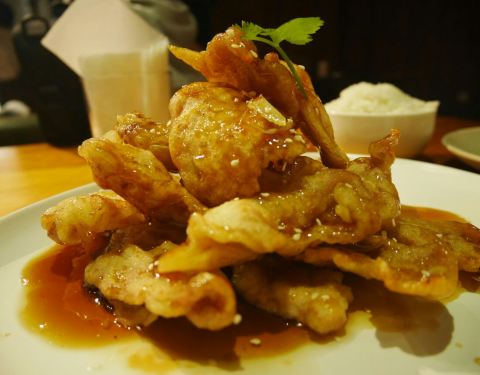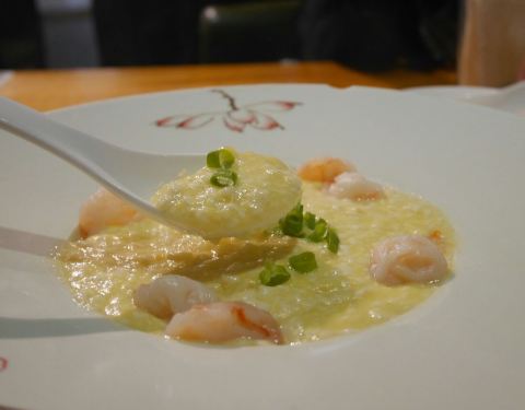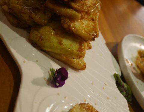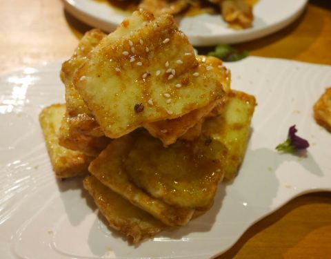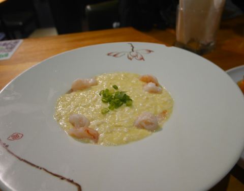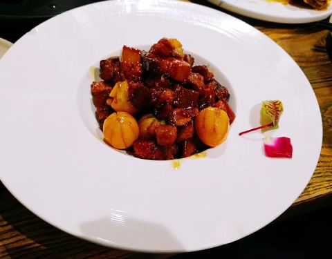 一家精致的辽菜馆,又有些融合川菜,环境很精致,服务也很细致。点了锅包肉,挂糊比较薄,跟哈尔滨的不一样,口感偏干,算酥脆,摆盘比较精致。秋天的茄子很别致,艺术范儿的菜名,茄子加了面炸过也是外酥里嫩的,挂糊是甜麻味道的汁。虾仁小豆腐,有点像汤羹,吃起来很舒服,虾仁做点缀调味很轻。