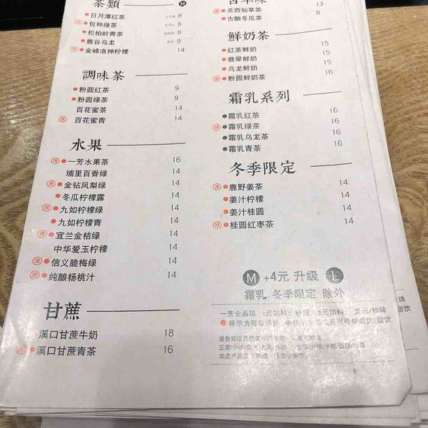 虽然是间饮料店,乍看有点像民国风的拍照地!有调味茶、水果茶、甘蔗茶、古早味奶茶、鲜奶茶和冬季限定等! 设计与取名都很讲究,每一个茶名,都是以产地起头命名。价位不算高,网友戏称文青一定要去品味的店! 粉圆鲜奶茶,是小农鲜乳+红茶调制出来的奶茶,官方说法是1/3杯的小粉圆,但是看上去足足有半杯的份量,软中带Q的粉圆口感,喝下来超有饱足感。 招牌:一芳水果茶。女孩儿应该会比较喜欢的水果茶,好喝还没有奶茶那么高热量。以松柏岭的青茶为基底,加入了百香果、柳橙、苹果、凤梨等满满的新鲜水果,喝起来不甜腻!我喜欢这款茶里面添加了百香果所带出的酸爽与颗粒口感。小杯50台币,大杯60台币 各地门店很多,这里分享几家门市: 高雄市苓雅区忠孝二路107号 台中市北区博馆路98号 台北市松山区民生东路四段66号