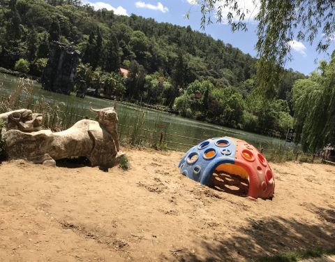 从昆明出发走昆曲高速从阿子营出口下再走一段盘山路,大概一个多小时能到,路边有停车的地方,还有卖各种小吃和野菜的小摊,附近有很多吃鱼的餐馆,门票20一个人,1.2米的小孩收半价,1.2米以下的孩子免票,进门左手边有儿童游乐设施,可以滑滑梯、玩沙、荡秋千,里面山青水秀,有一些人造景观,还有一个寺庙,里面的潭水养着很多金线鱼,池水清澈见底,还有海菜花,可以在寺庙门口买鱼食喂鱼,1.5一小包,公园里有很多绿植,还可以自费垂钓,推荐周末带孩子来走走逛逛