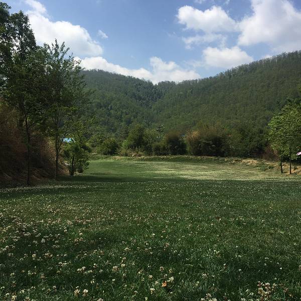 欢喜滑草场在丘陵山坡上建设,坡度达20度左右,周围植被葱葱,群山簇拥