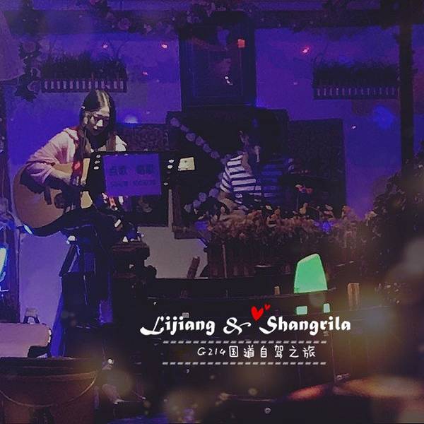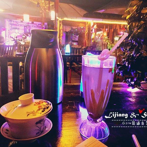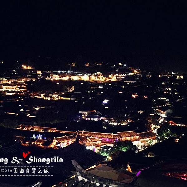 饭后天还没有完全暗下来,我们穿过四方街,往狮子山方向走去。一路上人潮涌动。。然后,我们进了旁边一家叫做“第一观景台”的店。。好多店都写着免费观景,终归觉得不好意思吧。。登上二楼,看到了丽江古城的天黑前的全貌。。沿边的位置都坐满了,长枪短炮早也早早定住。。我们选的位置视野并不是最好的。。露天顶楼,天暗下风有点大。客人越来越多,驻场歌手开始了他们的表演。。我们点了一杯热姜茶和一杯桂花普洱,96元。。恩,感觉点的这两杯,很有保温瓶泡枸杞的韵味啊,哈哈!!茶具(不知道叫啥名)跟我们的潮汕功夫茶具是一模一样的,只是功能不同,我们仅仅是用着泡茶,这店里是泡茶然后直接端着喝。。倒腾着拍了几张夜景。。慢悠悠地拨着茶盖,听着小曲叹着茶,再望望尽收眼底的这一切,好有“这片池塘被我承包了”的错觉感。。女孩洒脱地弹着吉他,男孩羞涩地打着鼓。唱了《原来你也在这里》、《一个像夏天一个像秋天》等耳熟能详暴露年龄的歌。。回来后小SS把录的视频回放了一遍,当时的氛围很有感觉。。也愿每个怀揣梦想的人,最终都能做到让自己满意。。。
