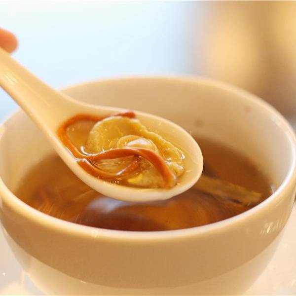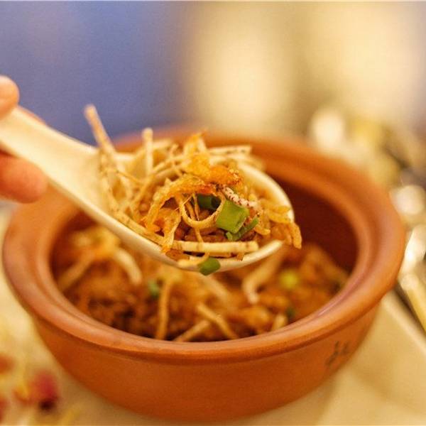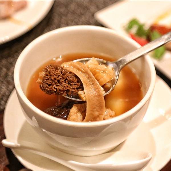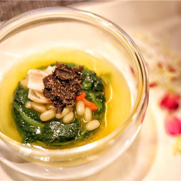 是不是听起来很多很多,其实和很多西餐一样,分量少,但是精致,一个人胃口大点儿吃的就刚好,我比较不爱吃饭,所以米饭都没吃完。鲜鲍野山鸡炖金石斛法国鲜肉芋头樱花虾炒饭佛跳墙芝士焗波士顿大虾黑松露流沙芝麻球,焦糖菠萝批椰子雪糕,蛋白杏仁茶汤丸蒜香黑椒牛柳尼泊尔高山岩米金汤煮时蔬这个我也忘记名字啦,比较偏甜强烈推荐 橙香烤鸭!大肋骨?名字记得不是很清楚了,但是上面的酱汁很不错!