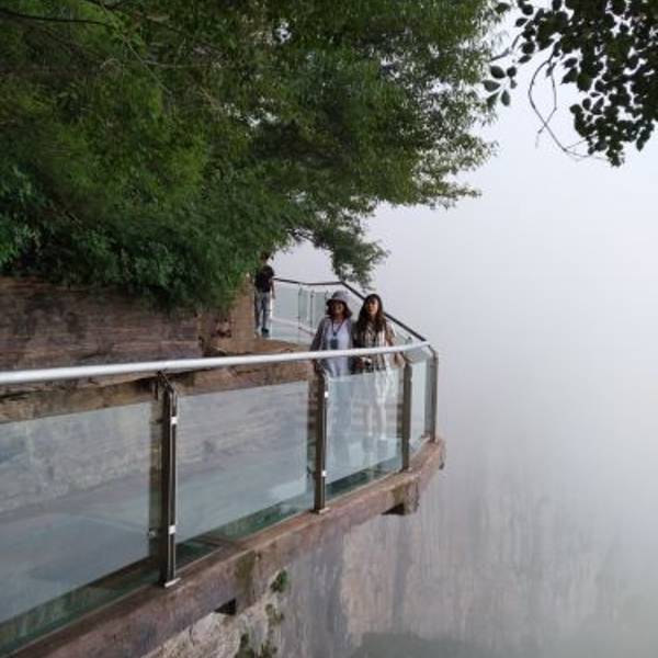 第四坑:天界山的景色还是不错的。同样,景交车只到达门口,上面需要30元的观光车绕山一周不,不然37度的高温走死你,去老爷顶需要坐缆车,或者自己爬上去。这里的坑在于观光车司机,到达第一个停靠站,司机说下车后右手边走栈道,他在栈道出口等我们。我们就傻傻地直接往右手边走了,结果天界山的标志性大石头在左手边,就没有登临,你说遗憾不遗憾,我们是完成了绕山一周后才想起来问司机怎么没看到那个大石头,他才告诉我们已经到过了。 天界山有两个栈道,一个是水泥的一个是玻璃的,在绝壁上走栈道还是比较刺激的,上面还有个老村,感觉也不错。如果服务再好点,也就不会留下遗憾了。我们没有坐缆车去老爷顶,因为转山一圈看到的景色也都全了。