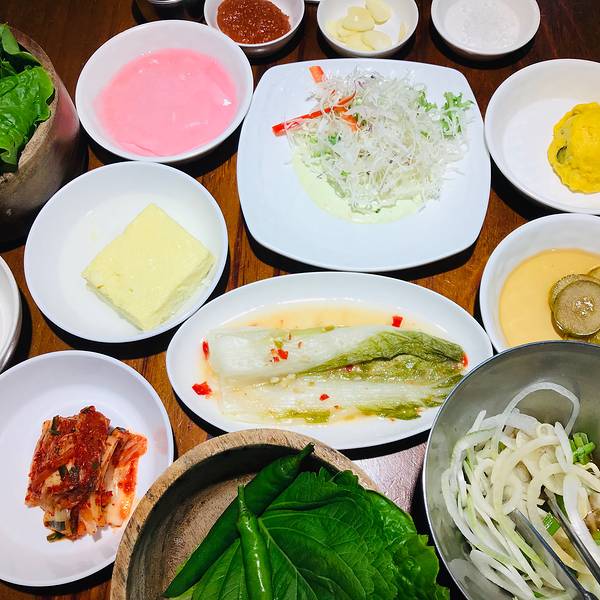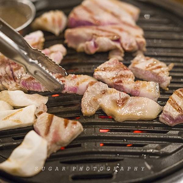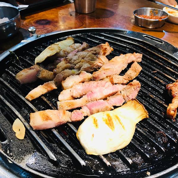 回酒店休整了一会儿,外出去吃韩国有名的烤黑猪肉。点了一个3-4人套餐,看着不多,肉貌似没有腌制过,全是原味的。烤熟后,蘸料、裹菜、拌饭,随你怎么吃。实话不如烤牛肉好吃啊!刚烤熟就没了,永远拍不到全乎的...