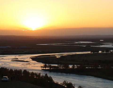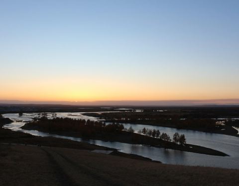 黑山头的迷人日落阳光就像魔法棒,点亮了天色,天空再把这边的河流染成蓝色。落日余晖下,树木裹上了金装,波光闪耀,交相映衬。