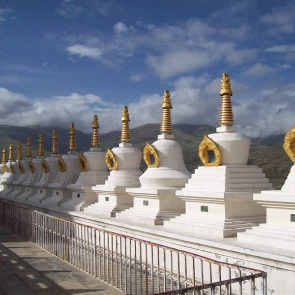 山崖上建有一座大型藏寺——白塔寺,一座高大的白塔四周围绕着一圈整齐划一的小白塔,众塔的金顶与庙宇溜金的屋顶在阳光下熠熠生辉;与该寺遥相呼应的是江对岸的第二神山与远方的第一神山(有三大神山,此处看不...