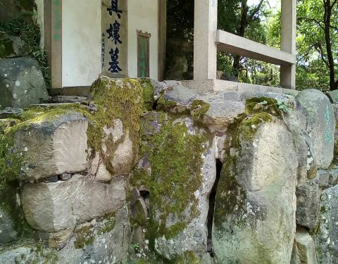 依岩建亭,东砌砖墙,嵌一大一小青石碑刻两方,均镌刻行楷 “古真娘墓”四字