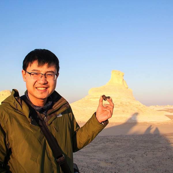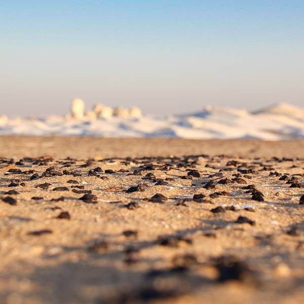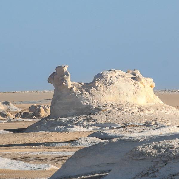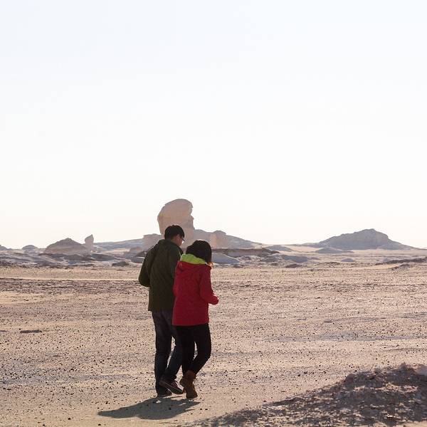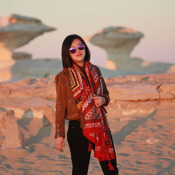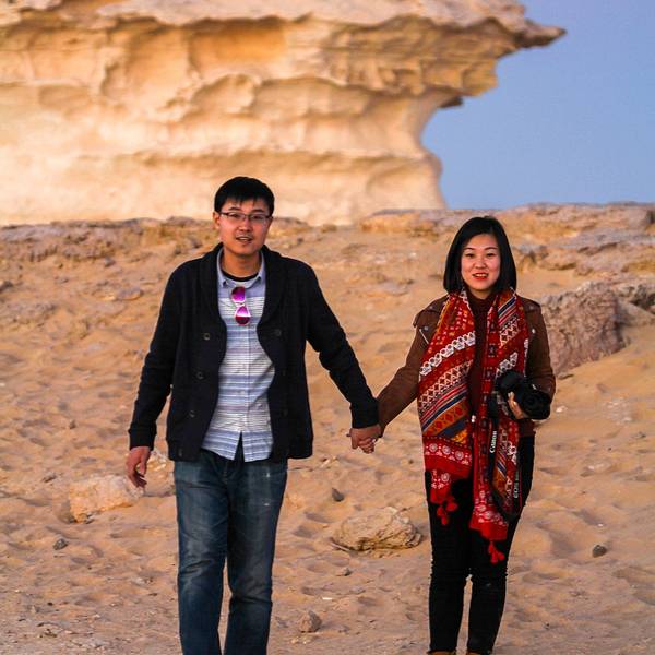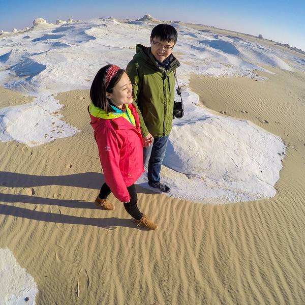 深夜,繁星满天,火流星闪划夜空。晨起,我发现我们被一座座白沙丘包围了,与前一天的“黑火山”形成了鲜明的对比。这些“白蘑菇”经历了大自然几千年的雕琢,神韵尽显。造物者的神迹让人折服,就像其他游记中记录的,“白沙漠,不属于地球表面的风景”白沙漠的车辙好像时光流逝的印迹,一端连着现实,另一端通向远方。欣赏完黑白沙漠的美景,我们第二天上午一路向北,直奔开罗。昨天奔向沙漠的热情已经褪去大半,剩下的只剩疲劳,沙漠的气候的确是早穿皮袄午穿纱,早上还需穿着羽绒服加冲锋衣,中午时分穿着一件T恤加外套就已热得受不了,再加上强烈太阳光,晒的皮肤红红热热的,车上的四个人睡得东倒西歪,也许只有睡觉会让这段不那么舒服的路程变得快一些。车还未开进开罗,大概刚刚过了十月十六日城,我们已经感受到首都的热闹,因为此时车子已经塞得动不了了。Y元老师坐在车子后座的最右面,旁边就是一辆载着满满一车西红柿的小货车,车主朝我们热情的打招呼,我们在车上讨论着,这时候如果能有一颗西红柿吃,那是多么美好的事啊。此时,埃及人对中国人的热情体现的淋漓尽致,Y老师只是回应着车主的招呼,说了一句,tomato good,车主就趁着塞车的功夫,身手利落,开门下车,到后面取了4个西红柿给我们。我的天啊,我们四个欢呼成一片,他在我们眼里简直就是下凡的天使。吃着酸甜可口的,凉凉的西红柿,仿佛这一路的疲劳和焦躁都已一扫而光,让我们开心的不只是这小小的西红柿,更是埃及人民的热情,