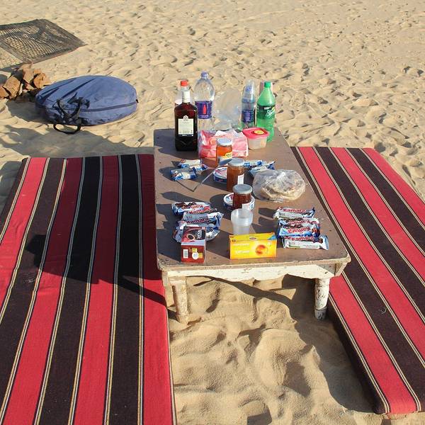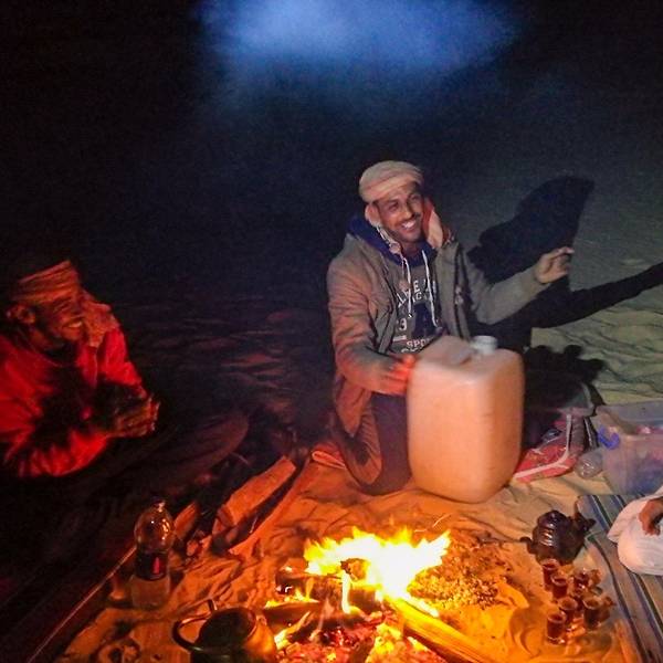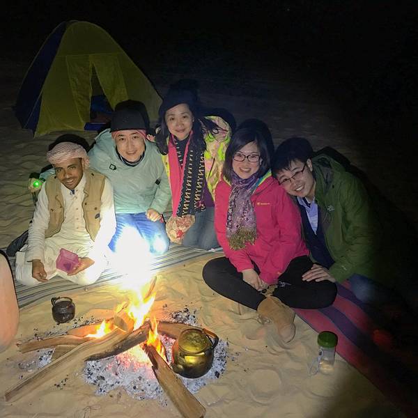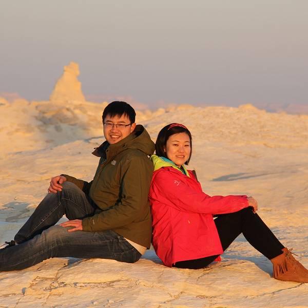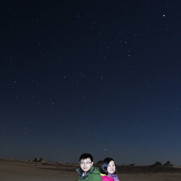 不知道是寒冷唤醒了我,还是众神不忍让我错过这骇俗的星空。我醒了,走出帐篷,眼前的星空景色让我惊呆了,夜幕像一条无比宽大的毯子,满天的星星像是缀在这毯子上的一颗颗晶莹而闪光的宝石……晚餐是司机给我们做的烤鸡饭,一天的游玩之后,在满天繁星下,吃一顿烤鸡饭,真是美极了。埃及的昼夜温差很大,跟东北有一拼,晚上,我们围着火炉聊天,劳拉姐姐的英文真的很流利,雪莉姐姐在那边拍星空,我跟阿宝也蹭了一张撒哈拉星空照。