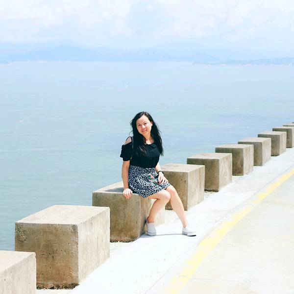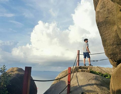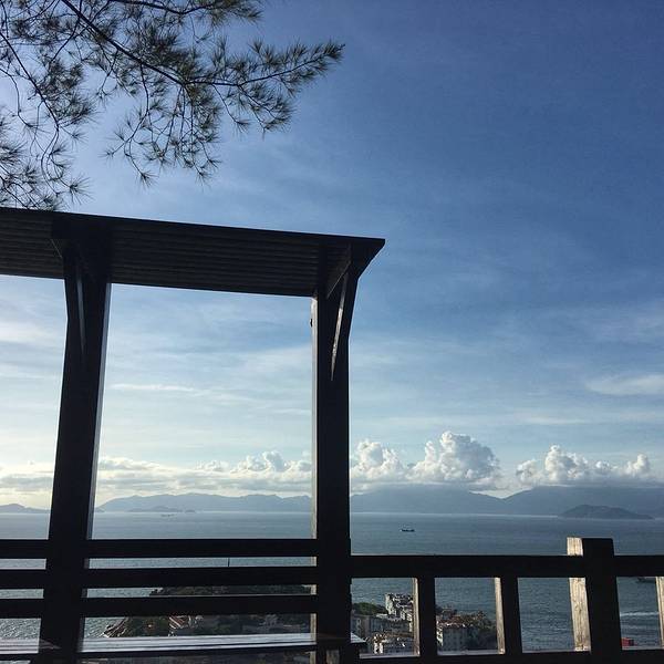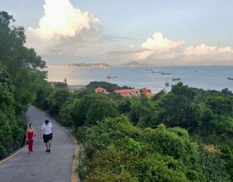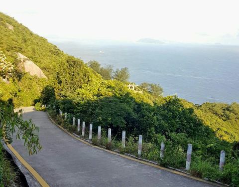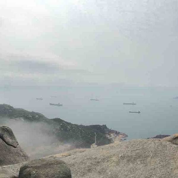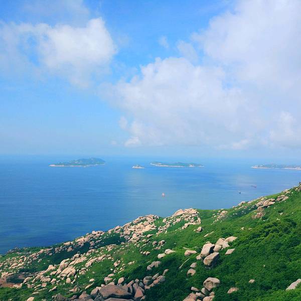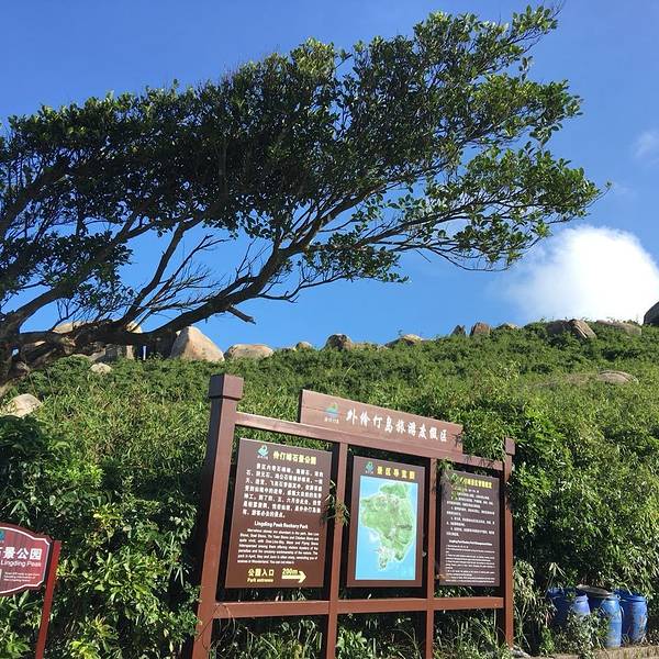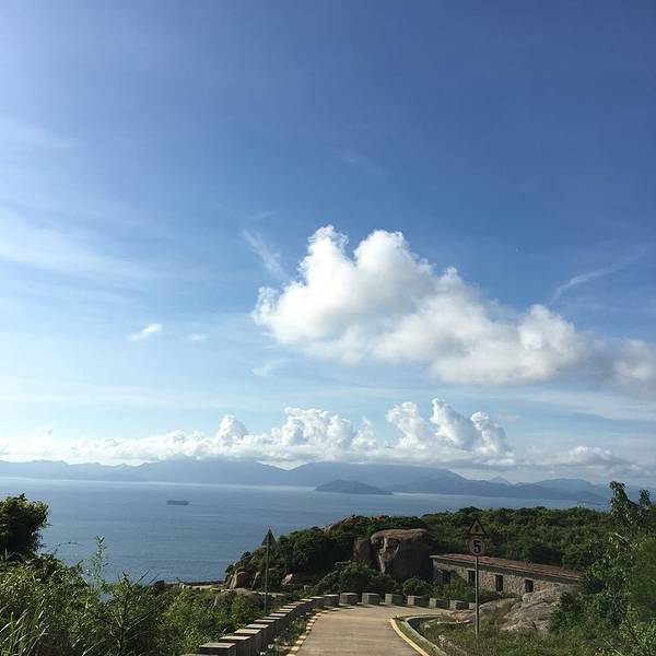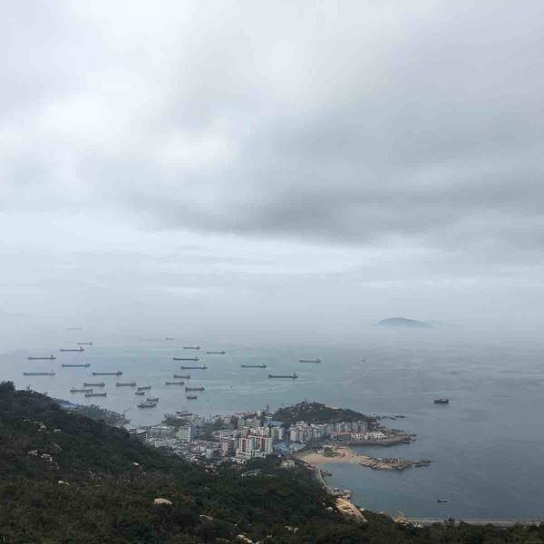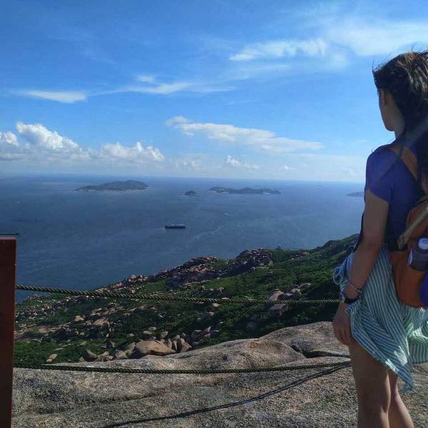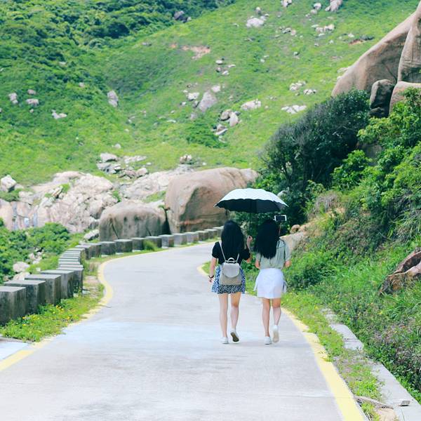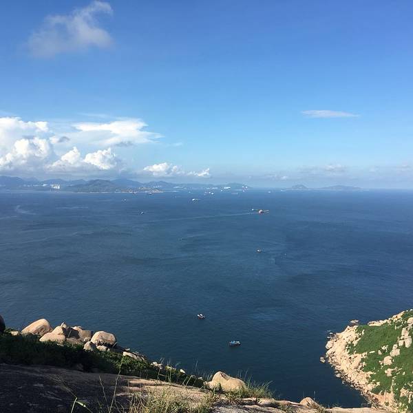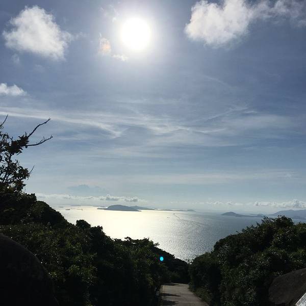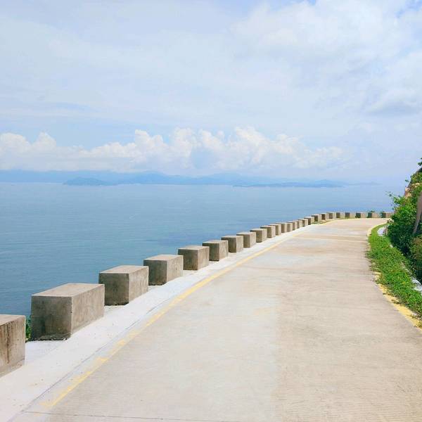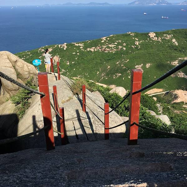 爬了将近一小时多终于到顶峰了,山其实并不高,主峰伶仃峰海拔311.8米,雄奇俊秀,深山藏古秀,瑞石撒幽香。景区内奇石嶙峋,惟妙惟肖,有海豹石、巨鲸石、雄鸡石、阴阳石等等,一线天、迷宫穿插其中,尽显大自然的鬼斧神工。(主要是这斜坡爬的太累了,60度的斜度在爬,全程几乎没有平路)绿道的标示终于到山顶的石景公园了,这树长的也是有点特色的雾海仙槎(长的高的来爬的时候记得一定要低头,因为这里的石缝都很窄)这个就是一线天,最高点的地方,也是拍照风景最美的地方从下往天山看有点“井底之蛙”的感觉这个石缝还算宽的了看到下面那个绿色水池的地方了吗?据说以前是个“矿场”,现在准备用来建发电厂。前几年的水还是蓝色的,现如今看就变成绿色的了。。。view真是不错~~~这是一条1200余级的石阶景观路通往大东湾,也就是矿坑的地方。这一条是2号绿道,但是据说没办法直接兜回沙滩,而且那条路没什么人走的,所以我们也就没有走下去看了。香江海市,对面就是香港了。这里的海真的是很蓝!!!逗留了大概五点半左右我们就下山了,但是这时候有人才刚上山呢。据说很多人会在半夜四点爬上来看日出,但是请备好手电筒。下山的分岔路有一条是往“塔湾”走的,就是2号绿道往大东湾走的,时间原因我们也没走下去了,因为还是要原路返回的。但这条路有点“沿海公路的出口”的感觉来的时候天气真的不错,很适合拍照的说,可惜拍照技术有限,还好天气不错,省了很多的后期滤镜晚上跟敏酱饭后来沙滩逛了一下,那晚的月亮很圆。(原谅我的技术没拍出它的圆感)