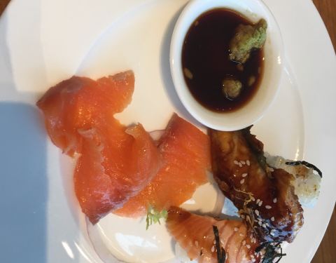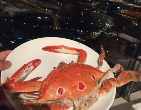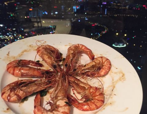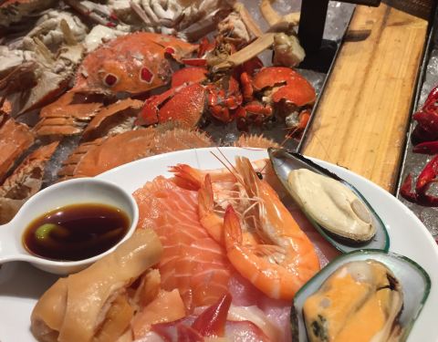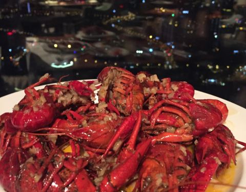 在64层高楼俯瞰锡城最繁华的景象,视觉上的享受远胜于味蕾的刺激。 从电梯出来就是咖啡厅了,前台引导入座后就没人管你了,自觉点取餐吧,别像我一样傻坐着。对了,没人帮你铺餐巾,毕竟不需另付服务费的。 俯瞰市中心的感觉很棒,登高望远,心旷神怡,更多表达不出的自行感受。 菜品数量不多,质量还行,比预期的稍好。 烤羊排肉质嫩,筋有点多,味道较淡,需蘸佐料; 刺身新鲜,三文鱼肉质肥美,鲷鱼口感清爽,北极贝爽脆,扇贝吃起来软糯; 小龙虾个头很小,肉质不紧实,感觉不太新鲜,没有评论的那么好。 铁板虾个头很大,闻起来像海虾,肉质紧实,酱汁味道好。 烤鸭是雷区,鸭肉油多、肥肉多,鸭皮不脆,肉质偏甜。 烤生蚝味道鲜美,个头小了点; 甜品随便选,感觉每一种都好吃,刷完一遍蛋糕冰淇淋,三文鱼就有点吃不下了饮料种类太少,没有鲜榨果汁,还好橙味气泡水比较清爽。 总体感觉还行,为了环境可以二刷。