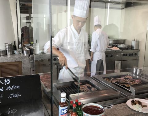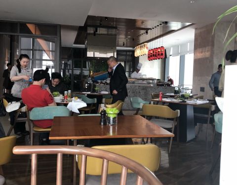 接待美国来的朋友,选择了苏宁广场64楼的凯悦酒店咖啡厅自助餐厅用餐。提前两天就预约了靠窗的座位,在吃饭的时候可以附带看景。吃的食物还挺合个人口味的,就是海鲜品种不多,烤牛排羊排有点老。小馄饨鲜美可口,小笼包稍甜,绿叶蔬菜品种太少,只有韭菜。最后吃了一个冰淇淋,大赞!