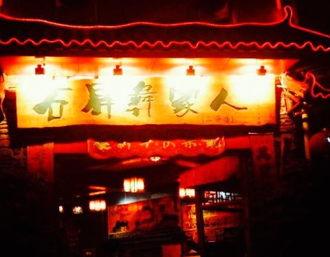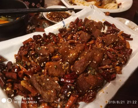 经过吃吃的地方,因为他家门口实在停了好多车,看门面还是蛮大气的,有民族特色,进来后,穿着民族服饰的服务生热情款待,我们两个人点的一荤一素一汤,半桶饭,合计54,还是很方便的,点的荤菜没听清到底是什么名,音似"。过焦毛肚"。端上来尝尝---味道及整体卖相象经典川菜"。毛血旺"。可是里面没有血旺,并且服务员也听不懂毛血旺为何物,吃起来是相当的过瘾---够麻。辣得也香。有特点的地方在于他家的小矮桌下还放有一大个簸箕,看似用途是供食客们摆包包和衣物的地方。