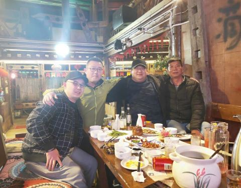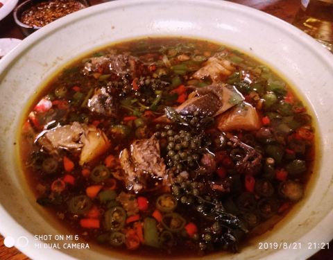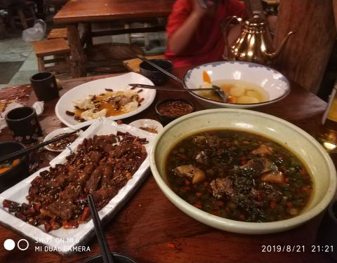 经过吃吃的地方,因为他家门口实在停了好多车,看门面还是蛮大气的,有民族特色,进来后,穿着民族服饰的服务生热情款待,我们两个人点的一荤一素一汤,半桶饭,合计54,还是很方便的,点的荤菜没听清到底是什么...