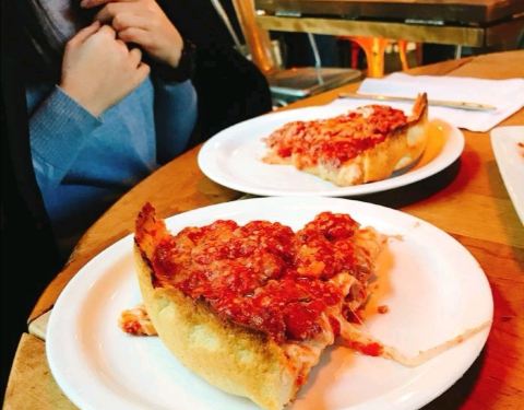 - 披萨是这里的重点,还有各种油炸食品,这家店在芝加哥各处很受美国人热捧,餐厅内美国人很多。气氛很热烈