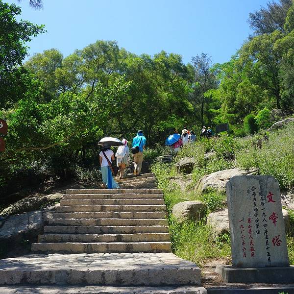 文峰塔 东门屿的主峰如同一个巨大的盆景。岩石叠起的山峰,怪石嶙峋,高耸于东山港出洋之要冲,一片坦荡的水,一座突兀的峰,相映成趣。沿着树木掩映的石径小道拾级而上,登上塔屿海拔91米的主峰,就可以见到文峰塔。塔为八角形密檐式实心建筑,共七层,由花岗岩砌成,是明嘉靖5年(1526年)由福建巡海道蔡潮所建,旨在为南来北往的商船和渔船指引方向。塔高31.7米,座围14米,从第二层起八面均有一幅浮雕,塔顶由两个葫芦状石头叠成。文峰塔保存完好,是该海域航行的的重要标志。为东山胜景之一,称“东屿文峰”。470年来,它经历了无数次的强台风、地震的袭击,仍安然无恙,顽强地站立在海岛之上。