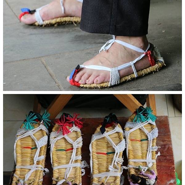 崖壁之上,密密麻麻悬挂着的,是驯养的蜜蜂。这是颇有名气的青城崖蜜。所谓飞泉沟,可闻名副其实。沿路水声淙淙,栈道湿阶。后山这台阶,明显比前山显得漫长。。路旁偶有摊贩,售卖除了百吃不厌的雪莲果,还有这种手工草鞋,很是吸引眼球镜头。