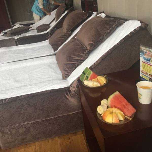服务很好。性价比高。蒸房石板房造型不错。休息区有免费饮料水果。儿童一米四下免费,198两个大人