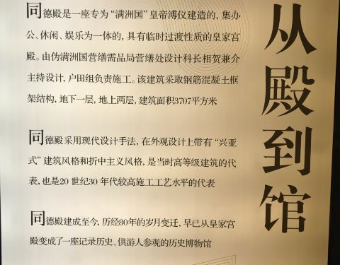 位于伪皇宫内,是其中一个主要的建筑。里面有广间、电影间、暖廊等,建设得相当坚固。一楼和二楼走一遍可以看到很多东西。目前其中有同德殿维修复原的陈列展览,可以获得更多重要信息。当年溥仪担心有日本人窃听...