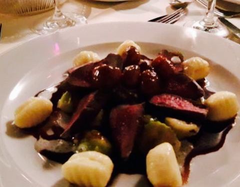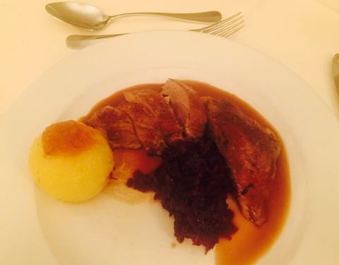 Duck breast from “Gutshof Polting” on Madeira sauce with vegetable and fried corn patties
