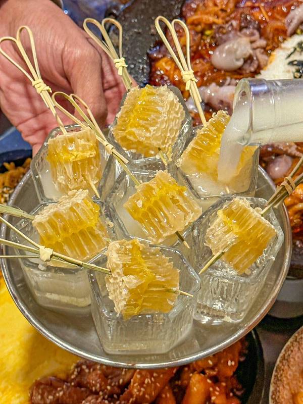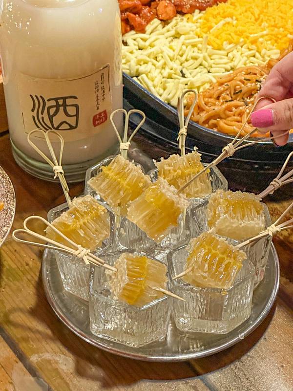🍶蜂巢米酒:晶莹剔透的蜂巢看起来真的好治愈!米酒的米酿味很浓郁,搭配上小块的蜂巢,蜂蜜自然香甜有增加一丝风味!好喝不上头,超适合和朋友们一起小酌!
