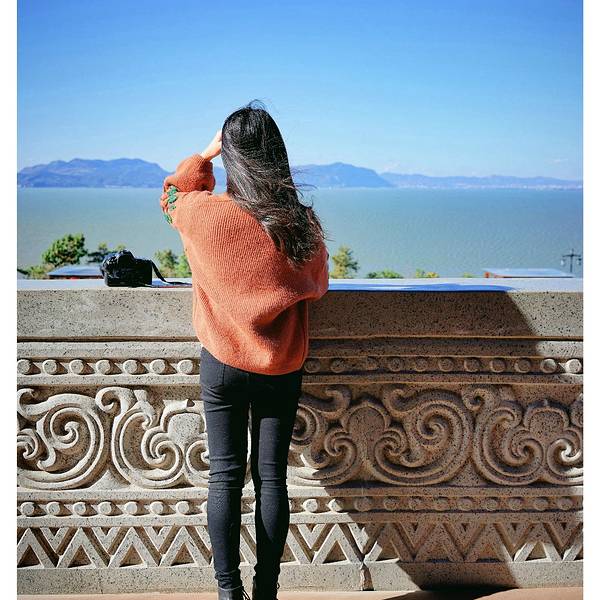 走出民俗体验中心,外面的天蓝得正好,远处山丘上一栋栋白色房屋映在水面,乍一看颇有些圣托里尼的味道。我想我一定是在成都吸了太多的霾,所以来这里立马撒起了欢儿,心情好到飞起来。从这里便可直接看到滇池,虽然阳光普照,风却一点也不小,朋友的帽子直接被吹飞,害得我们追着它跑了好远好远。