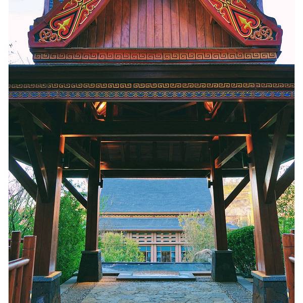 在我读书的时候,学校门外排队最长的也是一家号称来自云南的过桥米线,那时到了冬天去吃上一碗,胃也暖暖心也暖暖。现在想来,当年的自己不也和这赶考的书生一模一样么。如今来到云南,吃到正宗的过桥米线,感觉真是不虚此行。吃饱喝足,自然要在养老小镇上散散步消食,远远地看见旁边小山丘上有一座特别中国风的建筑物,想也没想便步行前往。不多会儿便走到了这栋建筑物前,原来这里便是民俗中心啦。