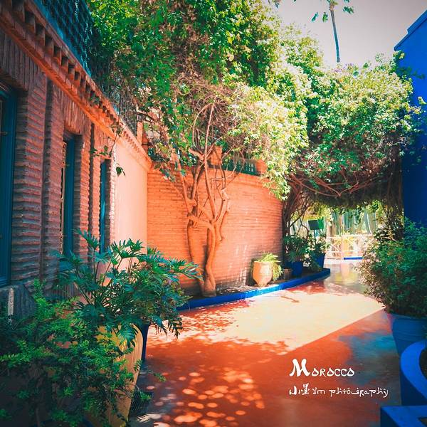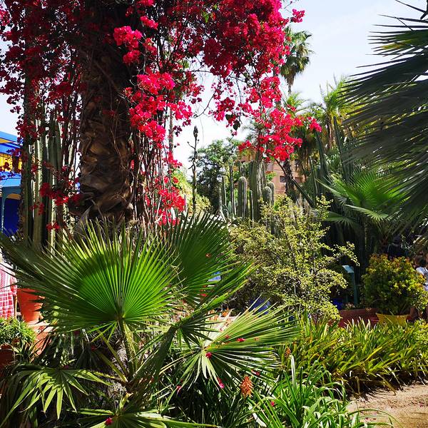 花园算是这炙热红城里的一处阴凉地。花园被翠绿的热带植物包围,仙人掌园,参天大树,藤蔓长廊,有种到了森林氧吧的放松舒适感。花园前后隶属于两任主人,第一任主人插画师马约尔,用了毕生精力设计建造了它,使其成为20世纪最神秘的花园之一。 第二任主人是伊夫.圣.罗兰Yves Saint Laurent,他使这座花园更加闻名于天下,毕竟连男生都知道YSL可以治愈女生的伤病。摩洛哥是个能把色彩用到极致的国家,连这个小花园也融入了诸多色调,大气但又不失小清新。
