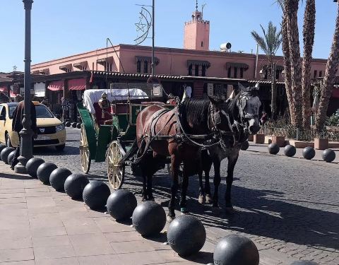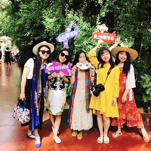 高饱和度的蓝色布满了墙面,黄色挂在盆栽上,精致的雕花,一座小花园,一个色彩的世界。每一处藤蔓垂下的走廊都不能错过凹个造型。阳光洒在氧吧,每一处角落都有笑脸和欢乐。在马约尔遇到了中国团,借着他们的牌牌,终于拍了张五人合照。花园不大,还有一处商店,商店里的东西价格不低,纠结了很久的包包没买很后悔。包包的皮质和设计完全不输大牌,琛姐一口气买了2只,还买了5个手镯。逛完花园,婷姐请我们做了马车游马拉喀什。