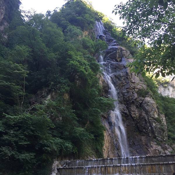 巴士车停留的第一个景点:莲花瀑布。莲花峰瀑布,海拔约1100米。位于太白山中一组恰似莲花的山峰上,在莲花中心的观瀑亭对面山巅,飞泻而下的瀑布雷声轰鸣,似一条白练临空飞舞,不由得使人想起“飞流直下三千尺...