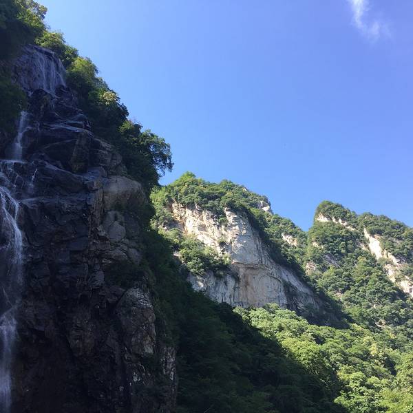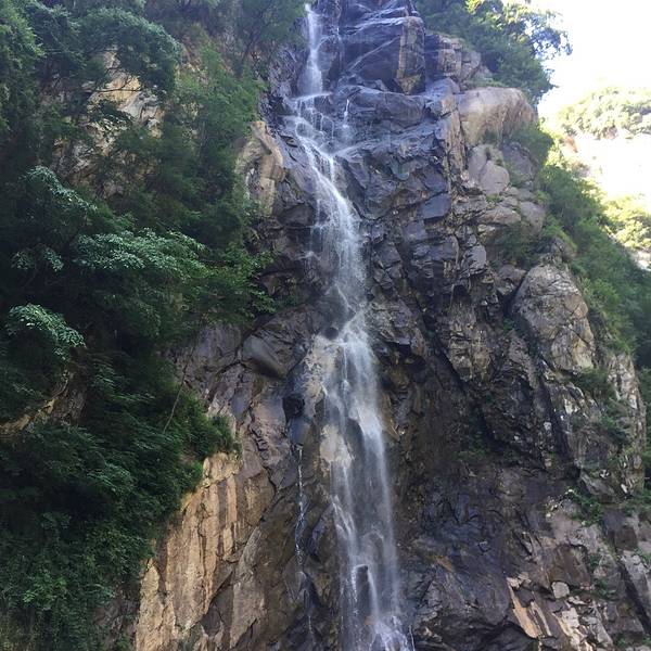 巴士车停留的第一个景点:莲花瀑布。莲花峰瀑布,海拔约1100米。位于太白山中一组恰似莲花的山峰上,在莲花中心的观瀑亭对面山巅,飞泻而下的瀑布雷声轰鸣,似一条白练临空飞舞,不由得使人想起“飞流直下三千尺,疑是银河落九天”的名句。莲花峰瀑布落差150米。此处瀑布飞流的山峰以“莲花’命名,一是自然地形酷似莲花。站在峰顶,四周的群峰组成莲花的花瓣,莲花峰居中而立,恰似花蕊置于莲花之心。 莲花峰瀑布是自然形成的,在唐代的时候西山居士施涧吾写有《莲花峰观瀑》一诗:“豁出青明涧,泻出万丈泉,如裁一条素,白日悬秋天。”