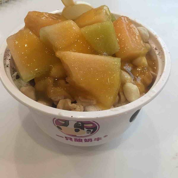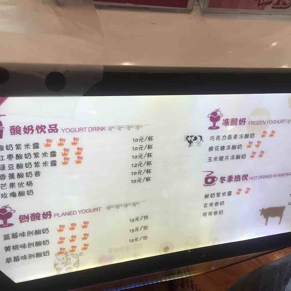 最近这个“一只酸奶牛”的饮品店很火爆啊,都感觉快成网红店了,在全国各地开的分店也特别的多,成都、重庆到处都开的有分店,简直是要刷爆朋友圈的节奏。重庆洪崖洞的这家“一只酸奶牛”也快成为重庆美食的标志了,几乎来洪崖洞就是人手一杯酸奶牛,不过买的时候一定要看清楚再看清楚了,有很多山寨的店铺,比如什么“一杯酸奶牛”、“一只酸牛奶”等等,一不小心就会买错。这家店离洪崖洞特别的近,也就一百多米到二百米的距离吧,店铺虽然不大,但是很干净卫生,服务员都是紫色的统一服装,做饮料的吧台上摆放着各种原料,还有一只特别可爱的奶牛,店铺的装修主要是以白色为主,和一般的奶茶店没什么区别。看了一下饮品的单子,都是以酸奶为原料做的饮品或者刨冰,也看到吧台里的冰箱放着各种牛奶,酸奶,感觉吃起来很健康,很放心。酸奶紫米露,10元一杯,推荐必点饮品,也是这里的特色招牌,也可以点红枣酸奶紫米露,也是10元一杯,但会多了淡淡的红枣香味。首先酸奶应该是加了牛奶的,喝起来味道不会很甜,刚刚好,但是又有酸奶的香味,感觉口感很细腻,喝到嘴里入口即化的感觉,有牛奶的香甜,又不同于一般的酸奶。这杯饮料里最大的特色还是在紫米,紫米也是很有营养的食物,将煮熟的紫米放在酸奶里,这样创新的吃法很不错。紫米吃到口中感觉糯糯的,也有嚼劲,第一次发现原来紫米和酸奶是绝配。除了喝饮料,还来了一份黄桃味刨酸奶,15元一份,一个可爱的印有奶牛的小碗装着,最下面一层是酸奶的刨冰,中间有饼干碎,感觉有点像是奥利奥的饼干碎,还有果酱,花生碎以及各种配料,最上面就是水果黄桃,满满的一碗刨冰,有颜值也有美味,吃到口中很清凉的感觉,黄桃也很不错,很嫩滑,一碗小小的刨冰里应该差不多有10种配料吧。总体来说这是一家很值得推荐的店铺,地理位置很好,逛景区逛累了就可以去买杯饮品休息一下,还可以顺便看一看江景,店里的环境也不错。其次饮品味道不错,其实并没有多少品种,总的来说就是酸奶和酸奶刨冰。但是每一款都很好喝,就是这样,东西不必太多,只要每一款都经典就行,并且给顾客的感觉就比一般的饮料健康有营养。店里面服务员的态度也很好,这家在景区的店,生意自然是很好的,很多时候都会排队,服务员也特别麻利的抓紧每一分每一秒的做饮品,也会耐心推荐饮品。洪崖洞周边有很多火锅店,如果吃火锅带上一杯酸奶牛去,边吃火锅边喝酸牛奶,很不错。