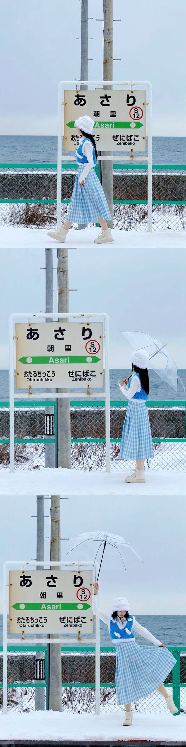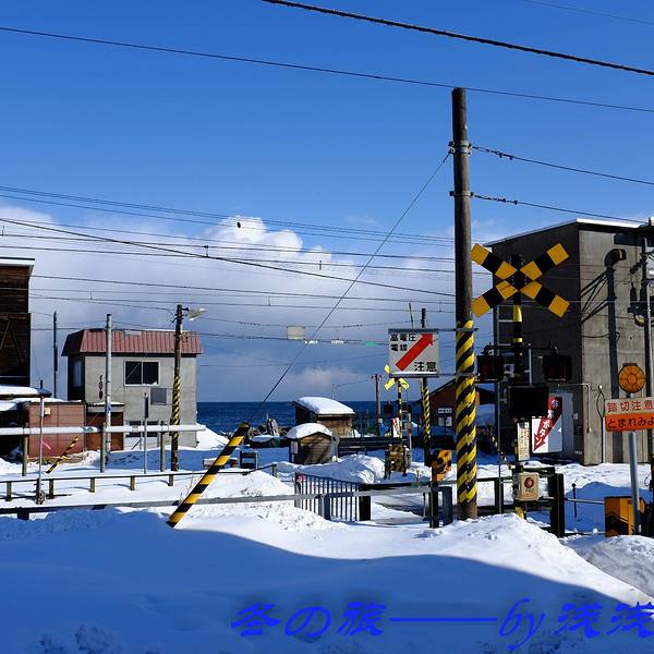 这段行程最出彩的地方,最出片的地方,位于大海旁的列车站,整个世界都是蓝白的浪漫色调。 如果去小樽,一定不能错过这个站点,挑选一班停靠朝里的JR列车车次,一路上,可以见到同时出现大海、大山、大雪、金色的阳光以及海鸥的篇章,极致震撼视野。列车到达朝里时,下车拍照,不用出站,下列车,过天桥到对面站台,就是美丽的海边。玩够了,再回到对面站台,等下一班列车上车去小樽站。当时刚好下大雪,海边风好大,把我们整个人吹得凌乱又搞笑,大雪打得眼睛也睁不开。