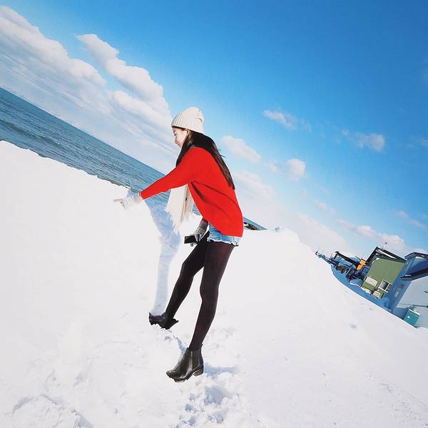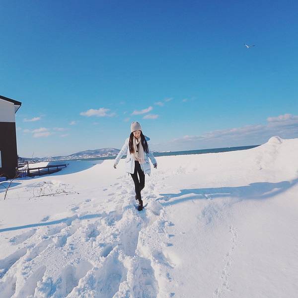 行前就知道小樽现在已经是游客聚集地,预料到也许会人山人海,所以并没有抱着太大的期待。倒是中间的小站朝里更有惊喜。铁轨边的海,小小的无人车站,童话一样的小房子,像极了日本动画片里的小乡村,恨不得定居在这里。想着日漫里女主角站在铁轨上的唯美,我也毫不犹豫的让王先生赶紧抓拍了一个系列。据他反应出来的效果落差那么大完全是模特的原因,跟摄影技术没有一点关系。出了站旁边就是民居,马路上空无一人,阳光晒着安静又暖和,控制不住自己撒起欢来。路边的小房子都是清新的颜色,面朝大海覆盖着白雪,真是无比羡慕住在里面的童话主人公们。走着走着就看到大海啦~~看了那么多各式各样的阳光海滩,雪地和海的搭配这是第一次见到。白雪把天和海水都衬的更蓝更纯粹,一眼望去,清新的一尘不染。玩的太高兴羽绒服也脱了,不过这身厚度只能坚持拍照的几分钟,再久就冻僵了。