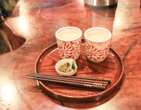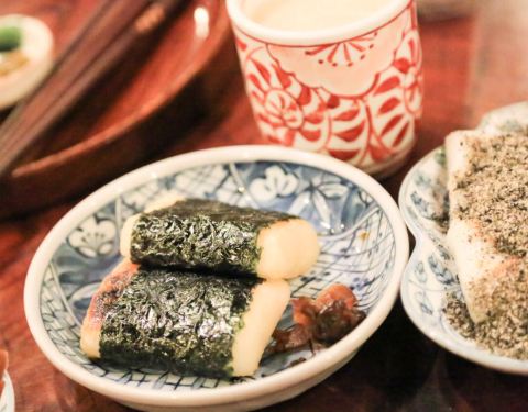 一家有故事的山间茶屋,历经400多年历史,直至现在仍保留了原汁原味的菜品——甘酒和力饼。甘酒其实是依靠米麯的制作手法制成的浓香略带甜味的饮品,不含酒精,适合旅人休憩时补充体力。芝麻味力饼,黑芝麻磨成细粉,满口酥香,淡淡甜味非常好吃。