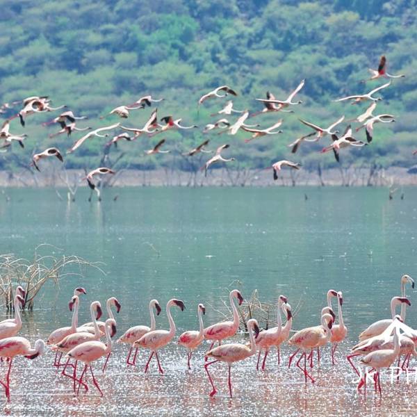 既然在纳库鲁湖看不见火烈鸟,那我们就一路驱车到博格利亚湖,继续追寻着火烈鸟的踪影,而我们也找到了。所以,现在的火烈鸟天堂,已经变成了博格利亚湖,这里也是全世界火烈鸟最多的地方之一。火烈鸟,是这片湖泊的宠儿和骄傲,它们清新脱俗的美丽,点缀着这片碧绿的湖水。以前只看过火烈鸟游泳圈,这次在肯尼亚终于见到活的火烈鸟了,然而火烈鸟的肤色并没有想象中那么红。细细的爪子站在水中,扑闪着翅膀,一个一个,蠢萌蠢萌地挤在一起,可爱极了。时不时组成一支整齐的队伍,翱翔在湖面上,划破青山和天际。