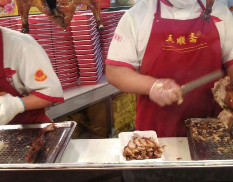 五顺斋的烤鸭看来在郑州还是比较有名的,分店有好几家,专业烤鸭。看着满满堆起来的盒子就知道生意有多好了,一般都有好几个师傅白天片鸭的,透着玻璃可以看的清清楚楚的,鸭肉装一份,鸭架子另做椒盐处理,到手的都是热乎乎的新鲜出炉的。