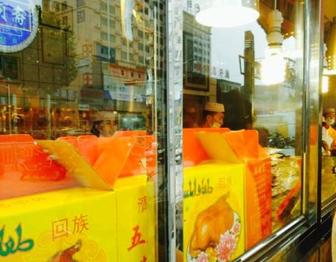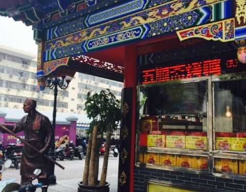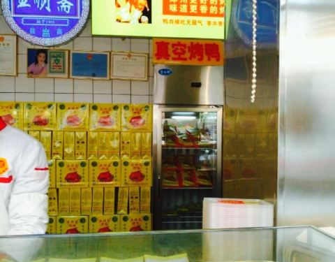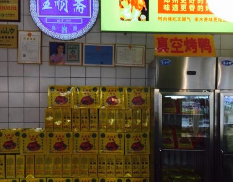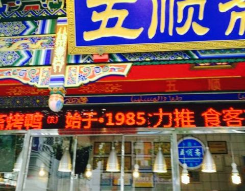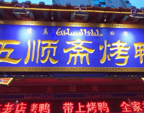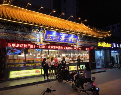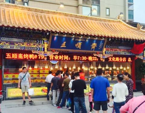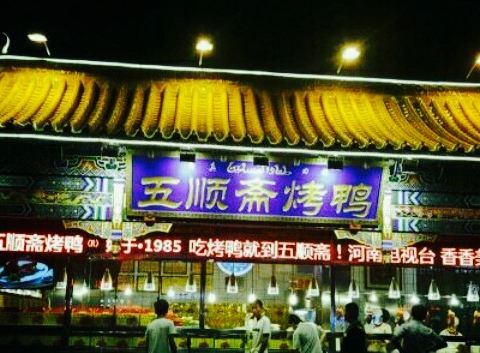 郑州老字号【五顺斋烤鸭店】创立于1985年,当地一个连锁品牌的专做烤鸭外卖的店面,在郑州市有几家连锁店,这家位于文化路白庙路的店面装修古式点雅,古色古香灯火辉煌的门头,气派的大档口,金黄肥美的整鸭挂门头,每次到了用餐时间都在排队,非常的受欢迎!