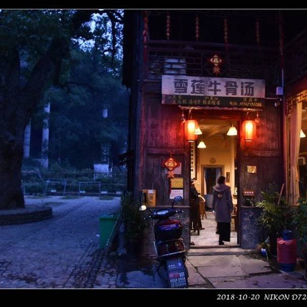 如果没有在下山的缆车处耽误那么长时间;如果当地的“王老师”没有带着我们一大帮队员试图加塞儿(未果,给轰到最后面)。 我们到达“上坦村”的时间应该刚刚好。 我们因为耽误了时间晚了半个多小时吧,到达上坦村的时候,已经没有什么光线可言了。拍照的时候全部依靠高高感光度,照片的噪点比较高。 上坦村和其他当地的村子都差不多,出名是因为电影《我不是潘金莲》中女主人公李雪莲的“雪莲牛骨头汤馆”是在这里取景的。