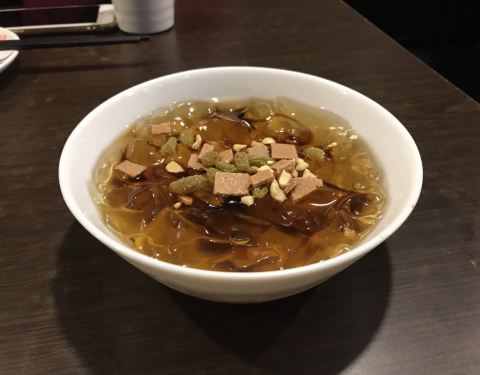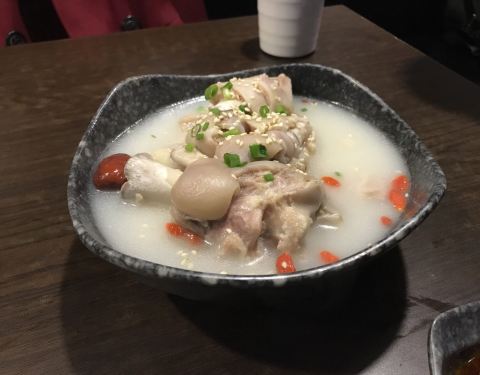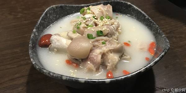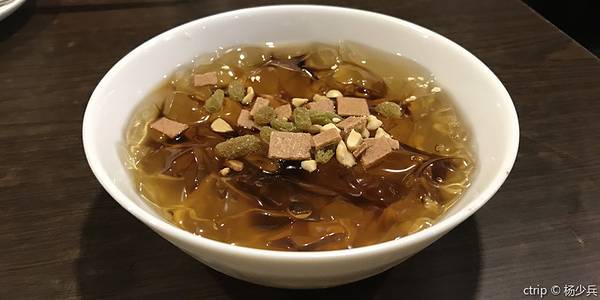 - 碗装的份量很足,鸭血味道不错,蹄花炖的入口即化,只是配的酱汁太酸了