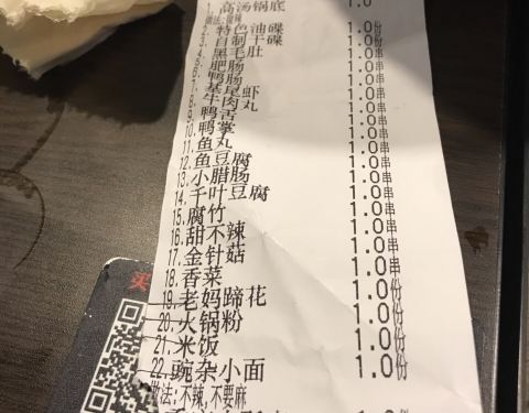 - 人挺多,支持在桌边扫码买单。串串很得劲,就是老锅需要加点盐,吃的略淡。两个人差不多得三十串,两份米饭