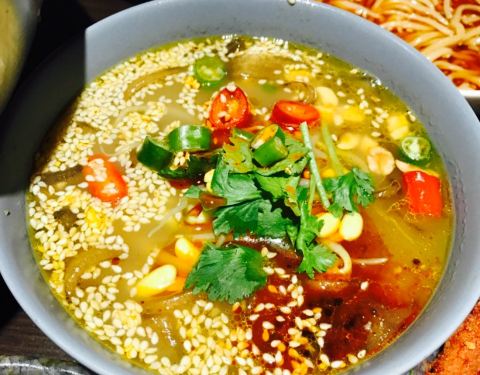 点了单人量的串,选择了椒麻锅底中辣,吃着一点都不辣。碗装的份量很足,鸭血味道不错,蹄花炖的入口即化,只是配的酱汁太酸了。豌杂小面吃到后面有点油,味道还可以,面很软的那种。