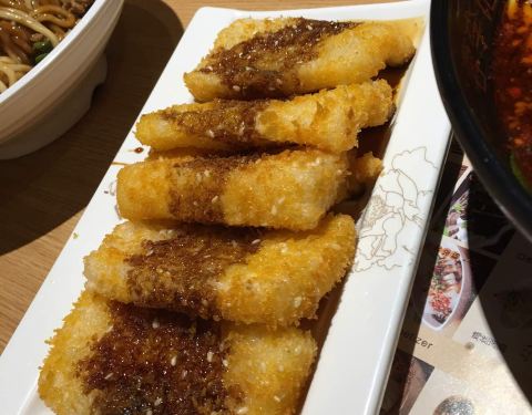 说实话吃着很一般,本来看了评价以为很可口,但吃起来确实不怎么样,点了唯怡豆奶,红糖糍粑,狼牙土豆,冒火锅粉,还有些串串,送了一个付式冰粉。红糖糍粑太甜了,狼牙土豆吃着就是一般的炸洋芋,还是酸麻辣的...