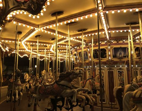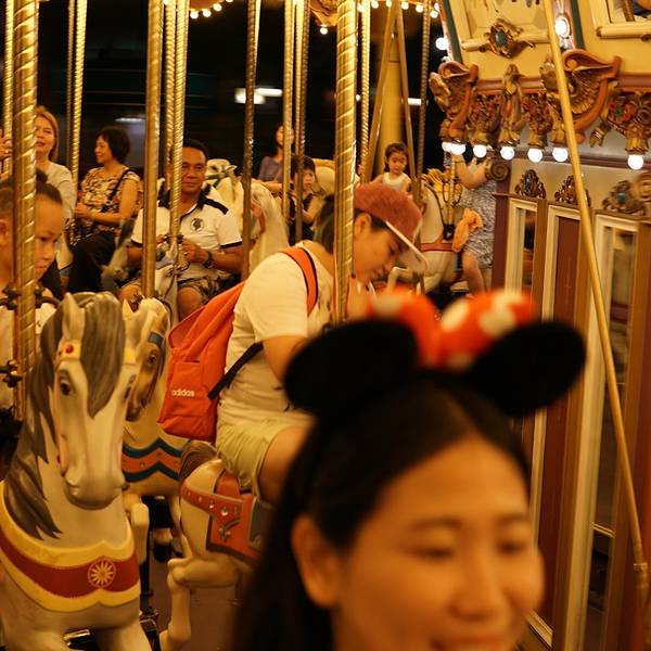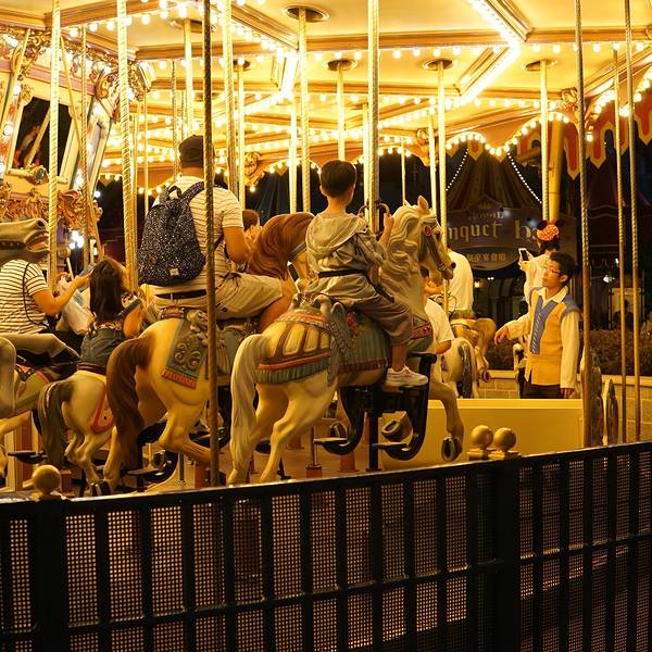 灰姑娘旋转木马会满足女孩所有的少女心与公主梦,排队人数较多。我比较喜欢看,夜景尤其漂亮。