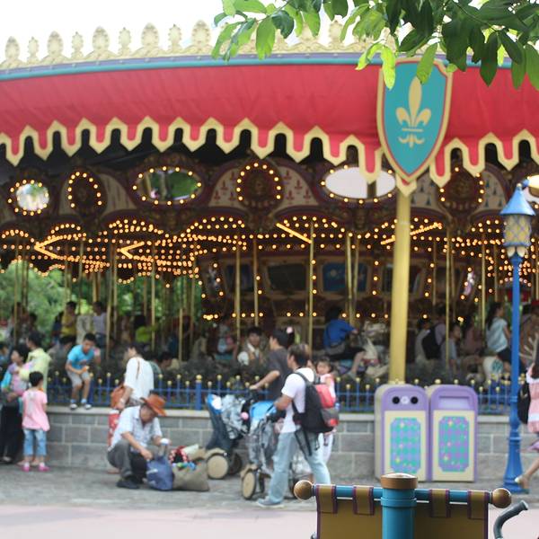 灰姑娘旋转木马的位置就在城堡进入后左手边的位置上,临近这里有个小空地经常表演魔术节目,小朋友第一次来的时候做了好几回,第二次来就不玩了,但玩了后侧的小飞象。这回直接过去了,孩子大了呀。