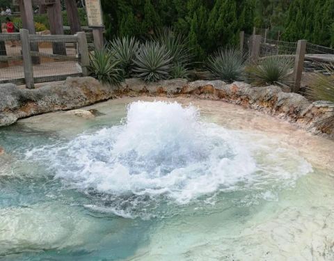 喷泉山谷在灰熊矿车旁边,有些人造的间歇泉和温泉。没过一段时间就开始喷水,山谷里蒸汽腾腾。另外还有水枪可以对射,非常好玩。