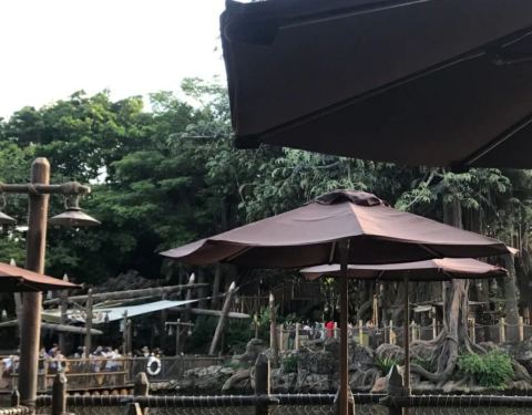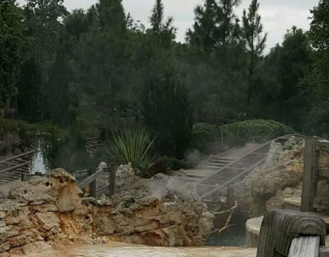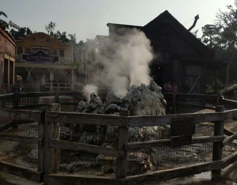 在香港迪士尼乐园里,有两处喷泉,一处是在入门美国风情小镇门口的米奇欢迎光临雕像,另一处是在灰熊山谷的边上。这个喷泉底座是个古怪造型,像是火山口的熔岩那样,喷发水是有间隙的,一旦启动时水柱冲高,还会有水汽腾腾的效果,非常有趣。