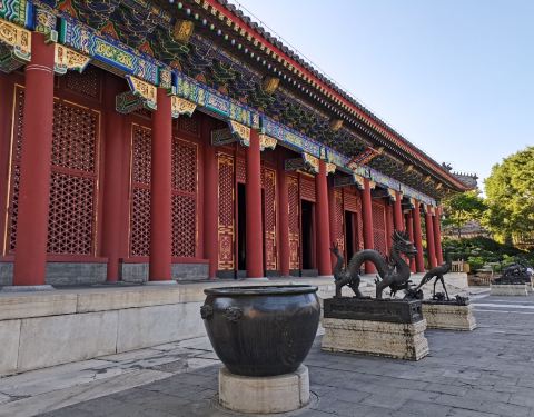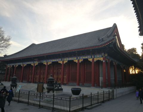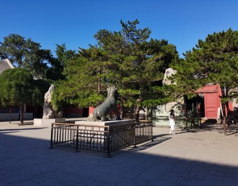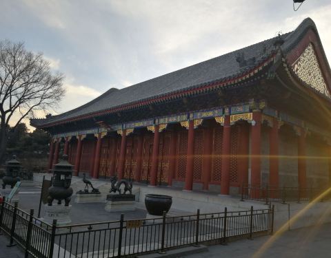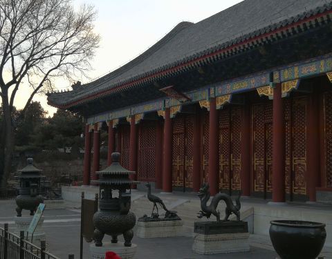 仁寿殿坐西向东,两侧有南北配殿,建筑精美,气势雄伟、皇家风范仁寿殿坐西向东,两侧有南北配殿,建筑精美,气势雄伟、皇家风范。殿前有一只铜铸异兽,为传说中的瑞兽麒麟,铜龙铜凤排列于仁寿殿前。