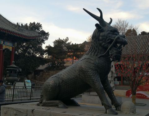 ...蹲在石须弥座上的铜铸异兽 ,龙头、狮尾、鹿角、牛蹄、遍体鳞甲,造型离奇怪异,是传说中的瑞兽麒麟